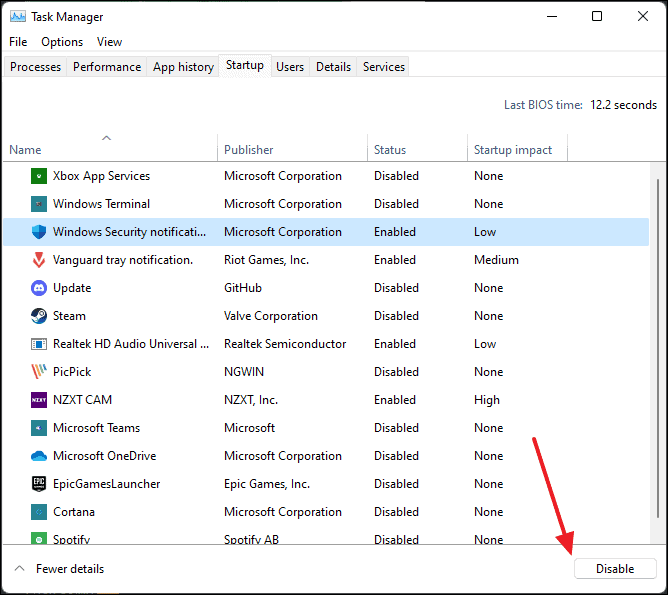 - In Task Manager, disable all startup items by selecting each one and clicking Disable.