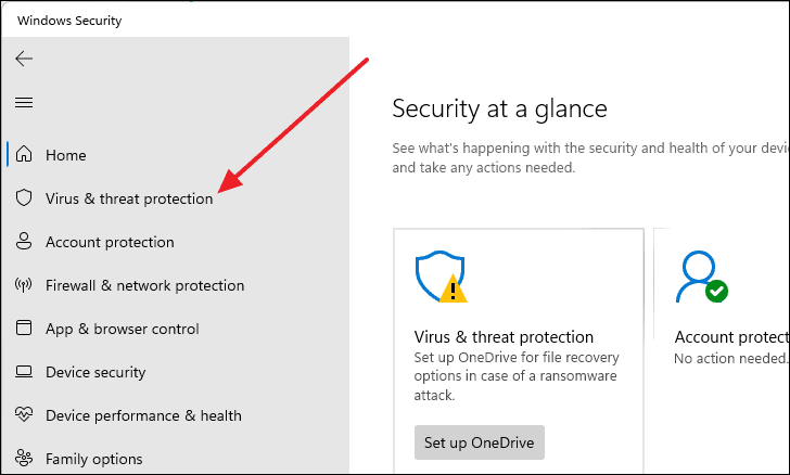 - In the Windows Security window, click on Virus & threat protection in the left pane.