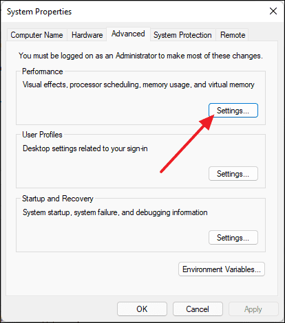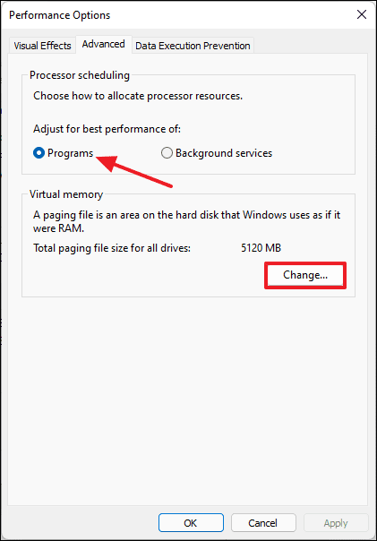 - In the Performance Options window, make sure the Adjust for best performance of: option is set to Programs.
