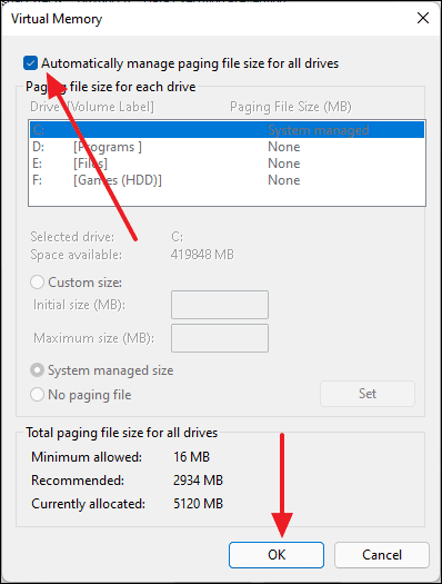 - In the Virtual Memory window, check the box for Automatically manage paging file size for all drives if it's not already checked. If it is checked, uncheck it and then check it again. Click OK.