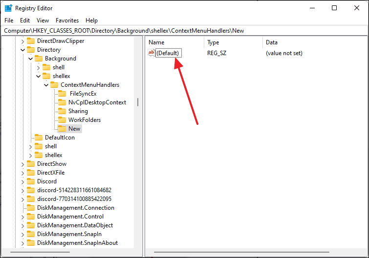 Newkey, then double-click on theDefaultstring value in the right pane.