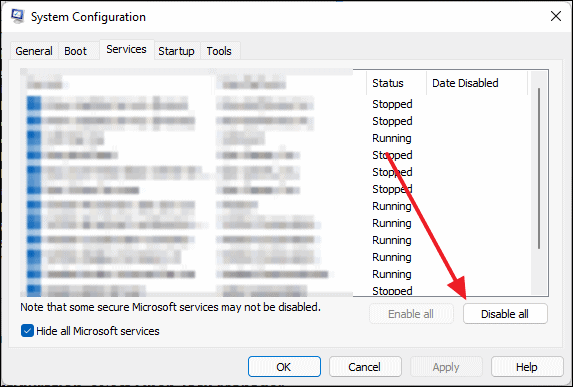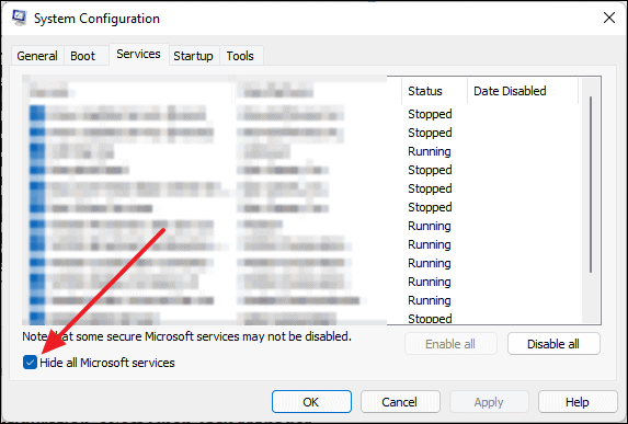 - Check the box that says Hide all Microsoft services to ensure essential services remain enabled.