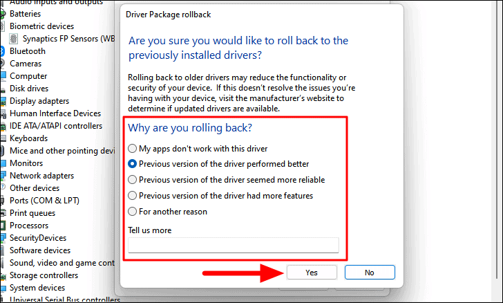 Step 4: Select a reason for rolling back and click Yes to proceed.