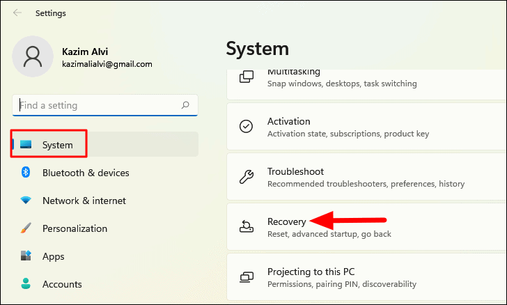 Step 1: Open Settings by pressing WINDOWS + I and select System from the left sidebar. Click on Recovery on the right side.