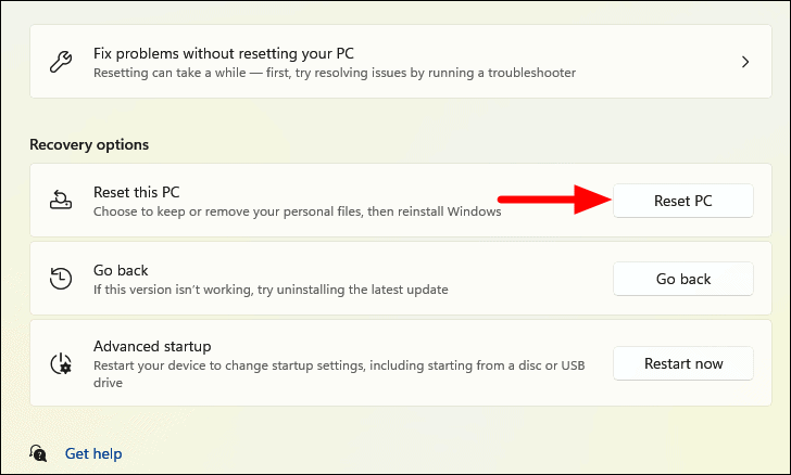 Step 2: Under Recovery options, click on Reset PC next to Reset this PC.