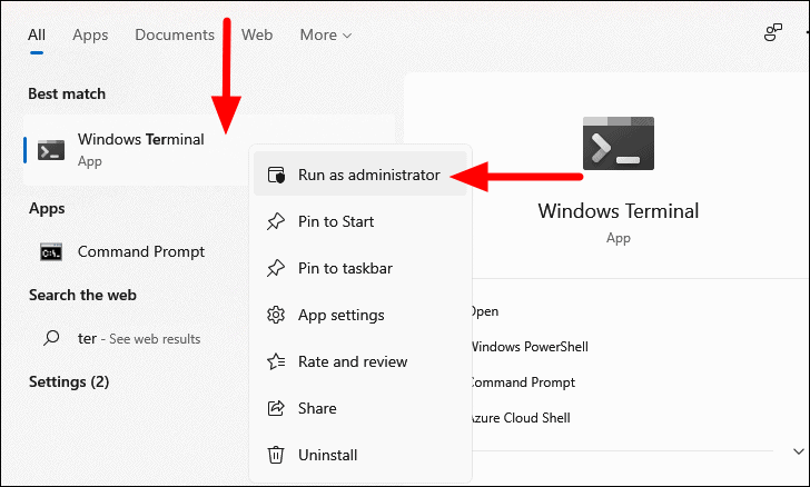Step 1: Search for Windows Terminal in the Search menu. Right-click and select Run as administrator. Click Yes on the User Account Control prompt.