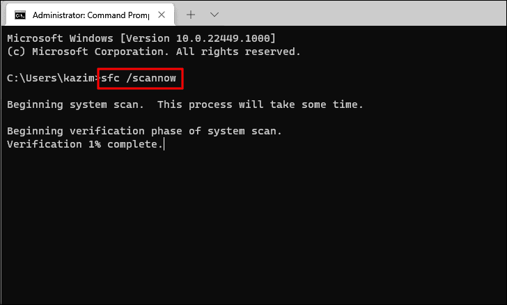 The scan will begin and may take some time. Once completed, you will be informed if any corrupt files were repaired. Restart your computer and check for the error.