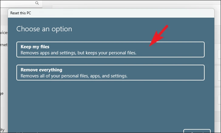 Step 5: Choose 'Keep my files' to retain your personal data or 'Remove everything' to perform a complete reset.