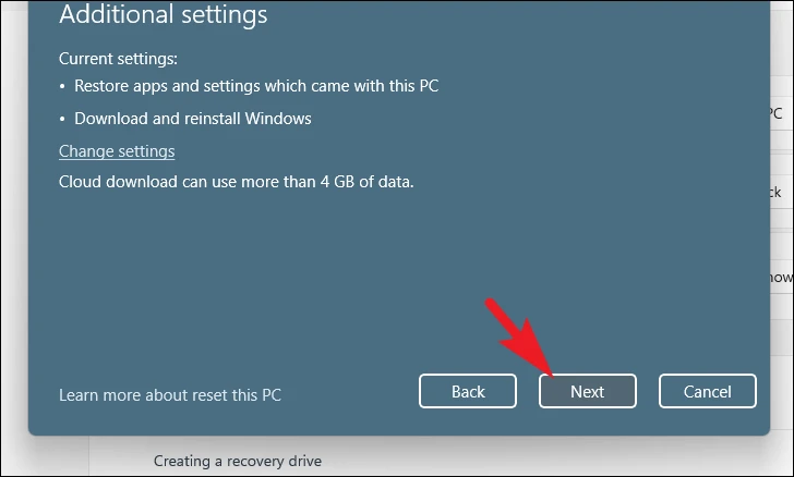 Step 7: Review your reset settings. If you need to adjust them, click on 'Change settings'. Otherwise, click 'Next' to proceed.
