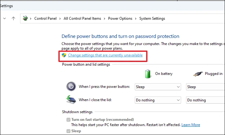 Step 4: Click on 'Change settings that are currently unavailable'. You may need to provide administrator permission.