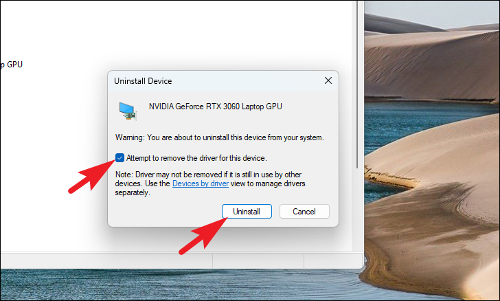 Step 3: In the confirmation dialog, check the box next to 'Attempt to remove the driver for this device' and click 'Uninstall'.