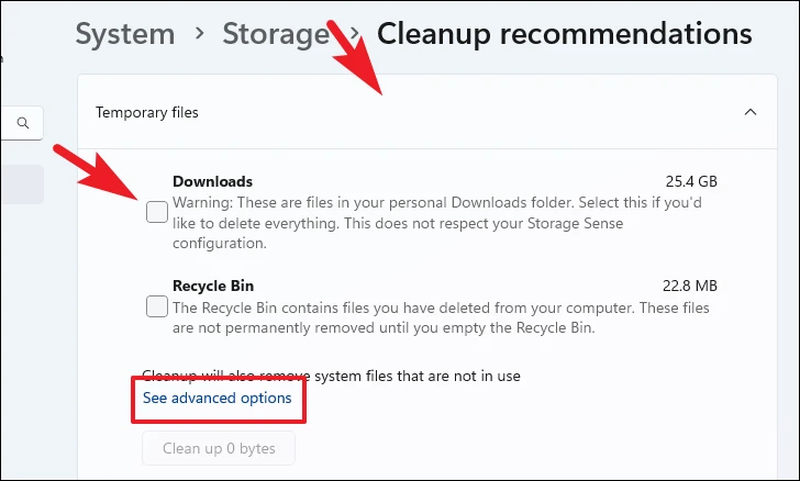 Step 5: Expand the 'Temporary files' section. Check the boxes next to the categories of files you wish to remove, then click 'Clean up'.