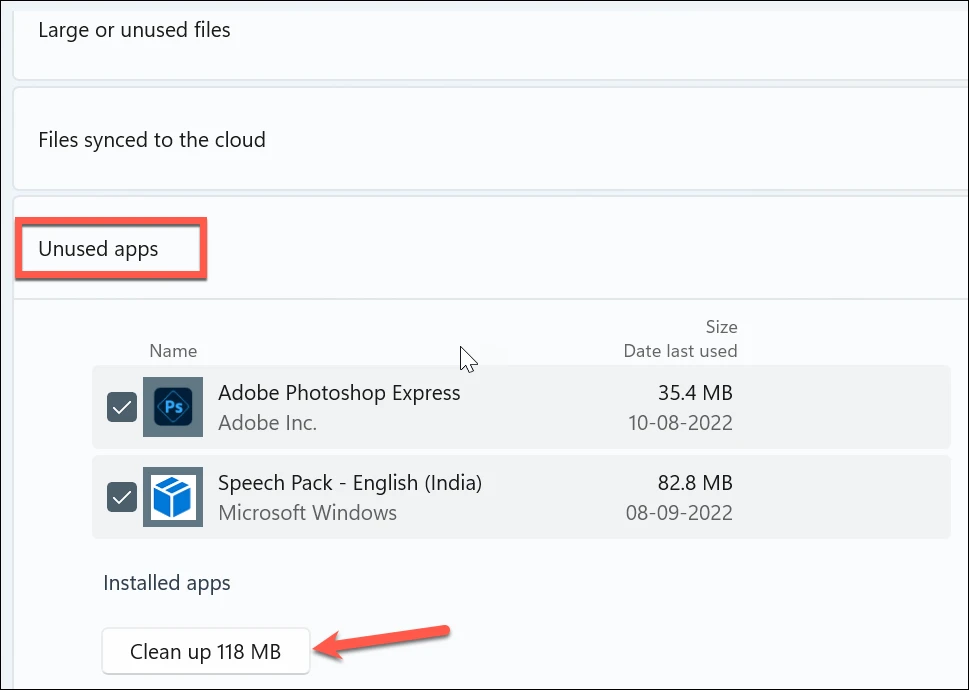 Step 7: Expand the 'Unused apps' section. Select any apps you no longer need by checking the boxes next to them, and click 'Clean up' to uninstall them.