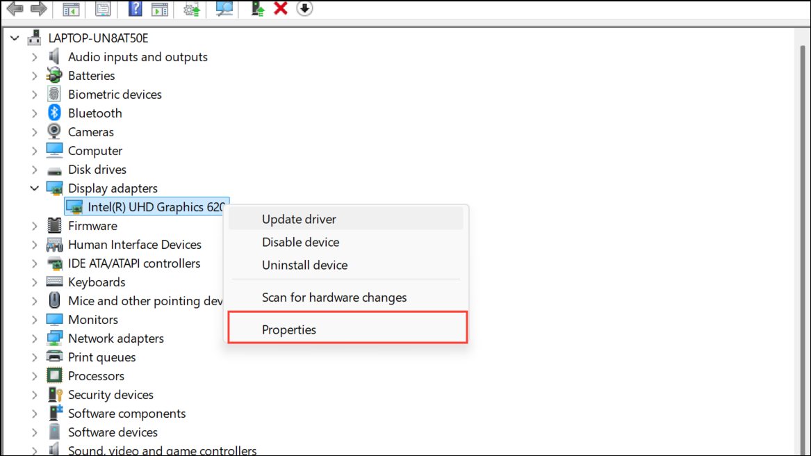 Step 4: If updating doesn’t help, right-click the device again, select Properties.