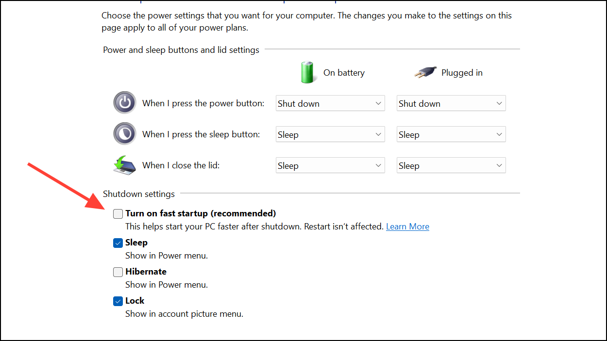 Step 5: Under Shutdown settings, uncheck the box labeled Turn on fast startup (recommended). Click Save changes, then restart your computer.
