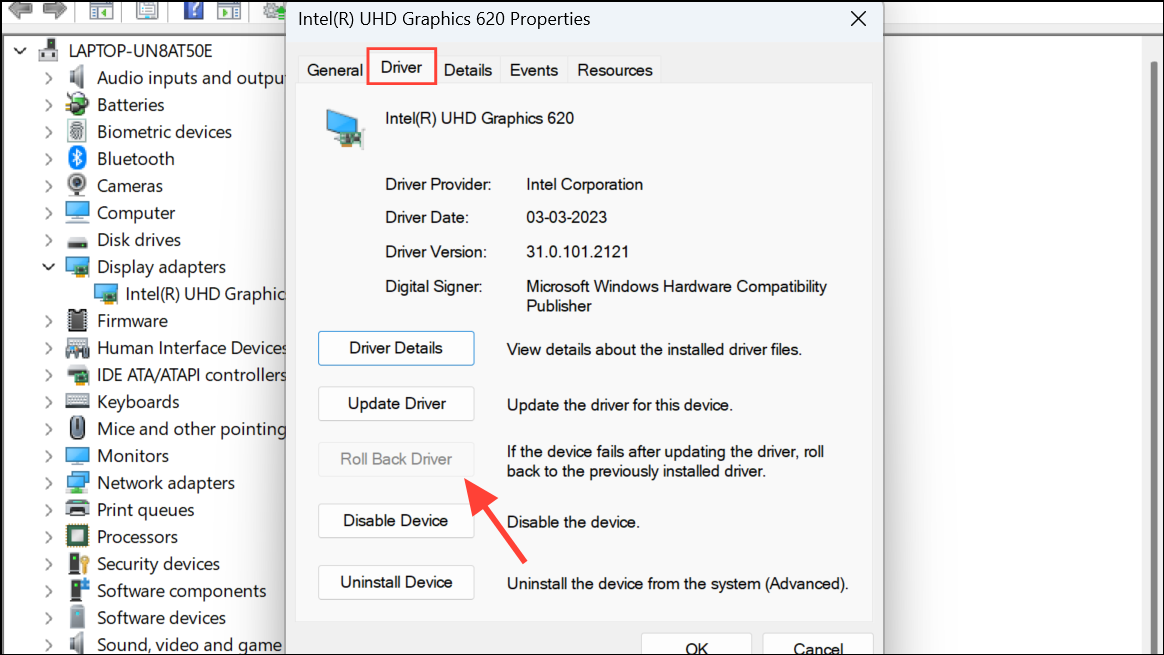 Step 5: Navigate to the Driver tab, and click Roll Back Driver if the option is available. Restart your system afterwards.