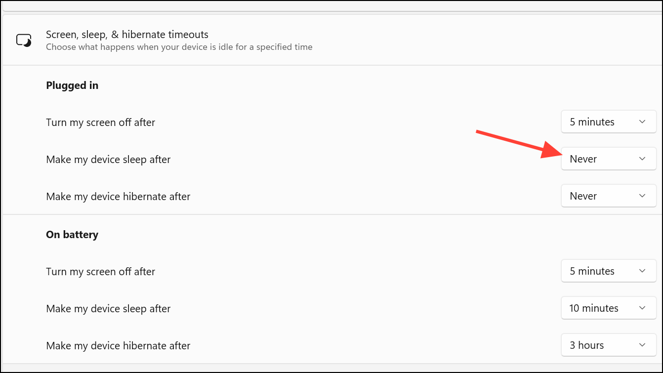 Step 2: Set Screen and Sleep timers to longer intervals or Never while troubleshooting.