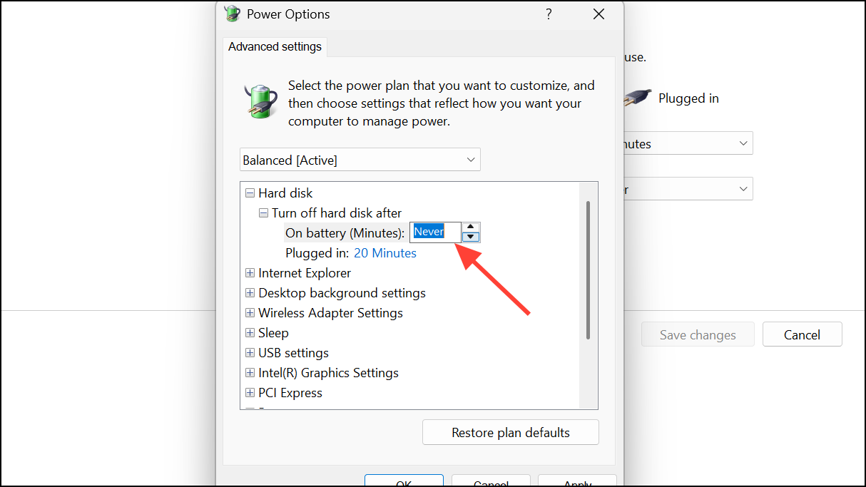 Step 5: Set Hard disk > Turn off hard disk to Never and review other settings for unexpected behaviors.