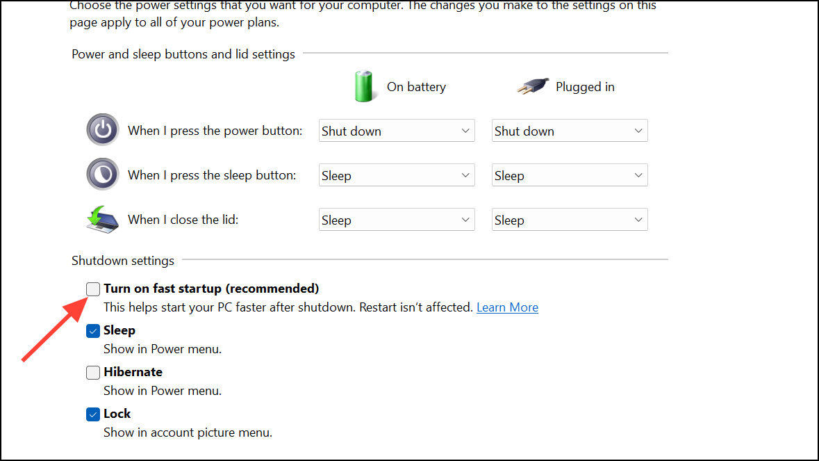 Step 6: Disable Fast Startup under Control Panel > Hardware and Sound > Power Options > Choose what the power buttons do. Uncheck Turn on fast startup (recommended) and save changes.