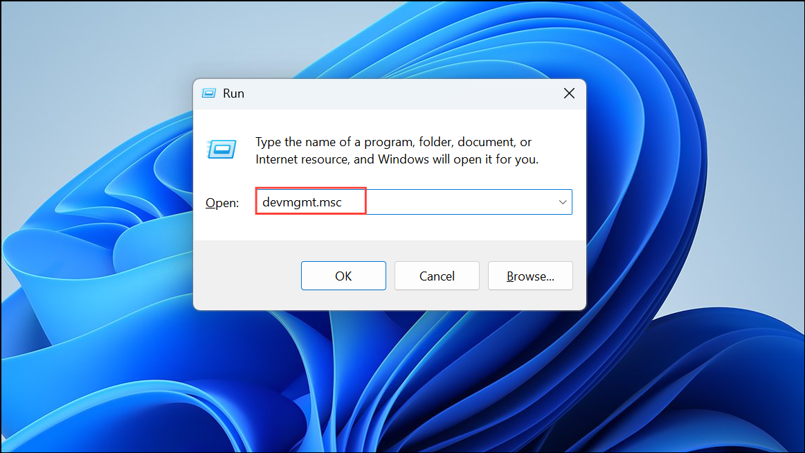Step 1: Press Windows + R keys simultaneously to open the Run dialog box. Type devmgmt.msc and hit Enter to open Device Manager.