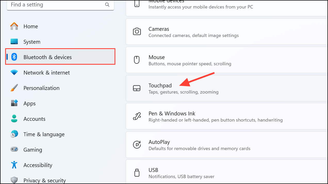 Step 1: Press Windows + I keys to open the Settings app. Navigate to "Bluetooth & devices" and select "Touchpad."
