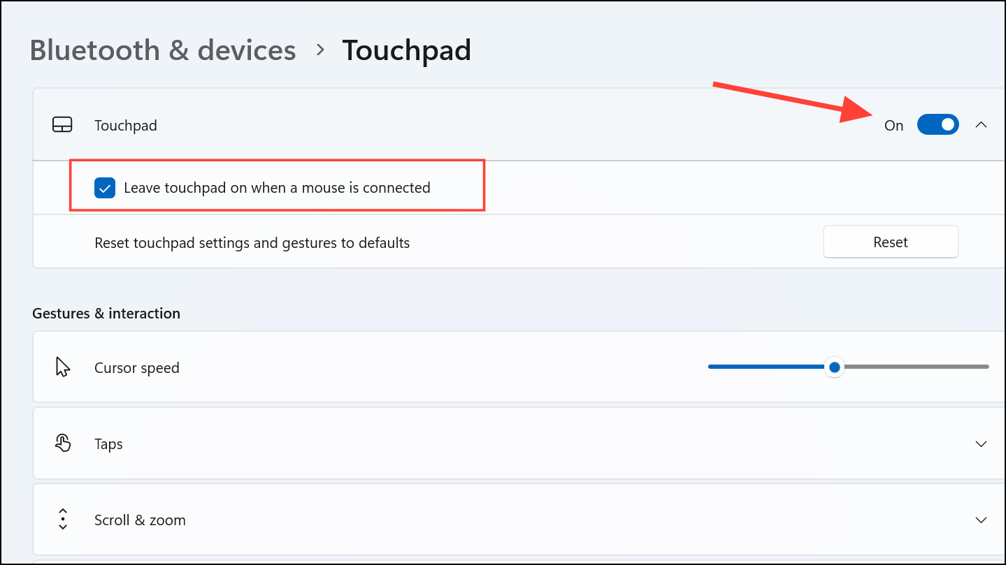Step 2: Ensure the switch under "Touchpad" is turned on. Additionally, enable the option "Leave touchpad on when a mouse is connected" if you prefer to use both devices interchangeably.