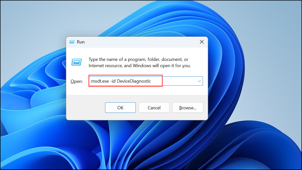 Step 1: Press Windows + R, type msdt.exe -id DeviceDiagnostic, and hit Enter.