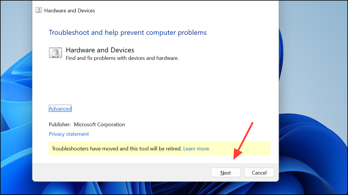 Step 2: Click "Next" in the troubleshooter window and follow the instructions. The troubleshooter will scan for hardware problems and automatically apply fixes if necessary.