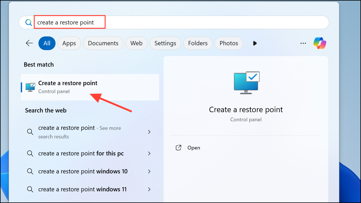 Step 1: Press Windows + S and type "Create a restore point." Open the corresponding settings option.