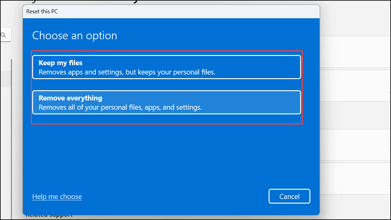 Step 3: and choose either "Keep my files" or "Remove everything" based on your preference. Follow the prompts to complete the reset process, which will reinstall Windows and restore default settings without affecting your personal files (if selected).