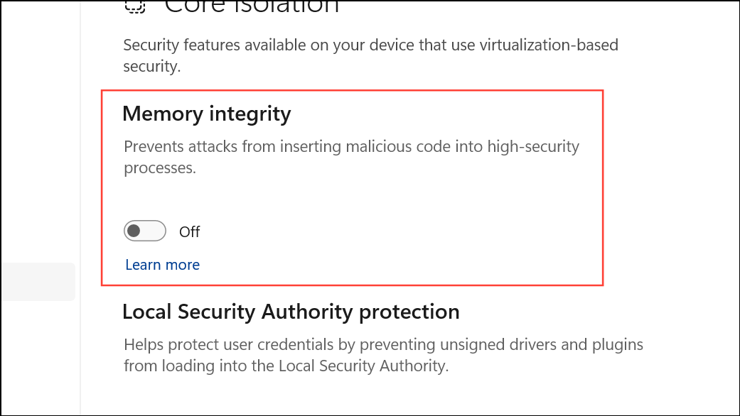 Step 1: Open the Windows Security app and navigate to Device Security > Core Isolation. If you see a warning that Memory Integrity is off, look for a Review Incompatible Drivers option. Click this to see a list of drivers that are blocking the feature.