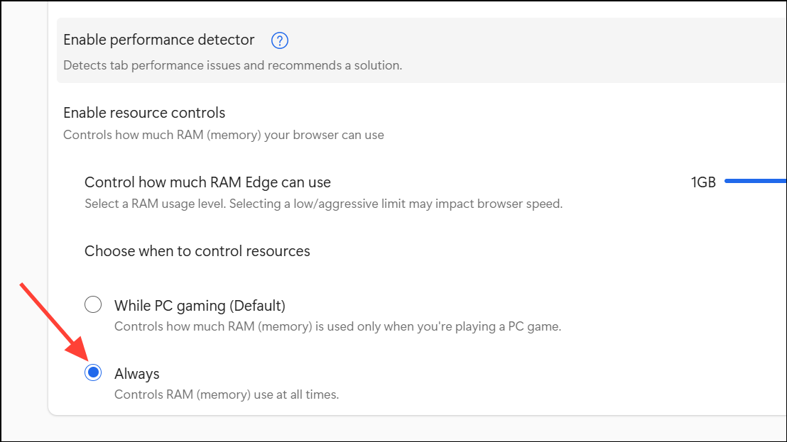 Step 3: By default, Edge will limit RAM usage only during gaming. To apply the limit at all times, select Always from the dropdown menu.