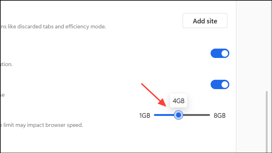Step 4: Set your preferred RAM cap. Be aware that a very low limit may cause more frequent tab sleeping or page reloads, which can interrupt browsing. Monitor performance and adjust as needed.