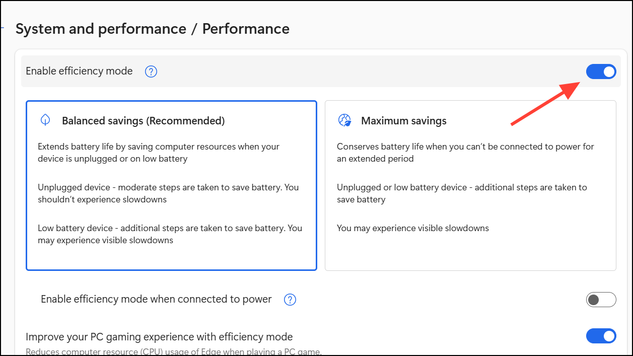 Step 2: Find Efficiency mode and toggle it on. For best results, set it to Always.