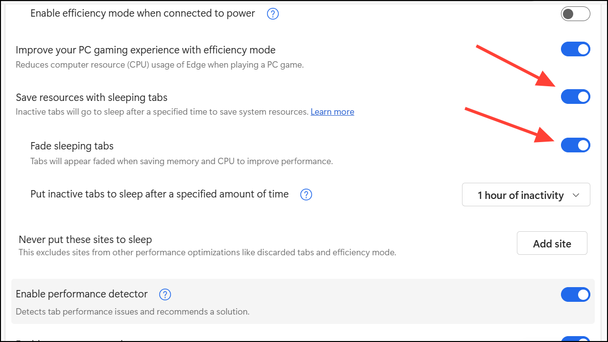 Step 3: Scroll to Save resources with sleeping tabs and enable both Save resources with sleeping tabs and Fade sleeping tabs. This will visually indicate which tabs are asleep.