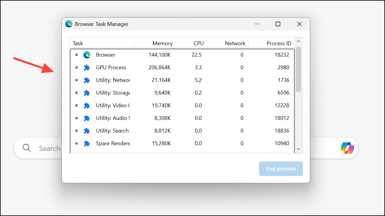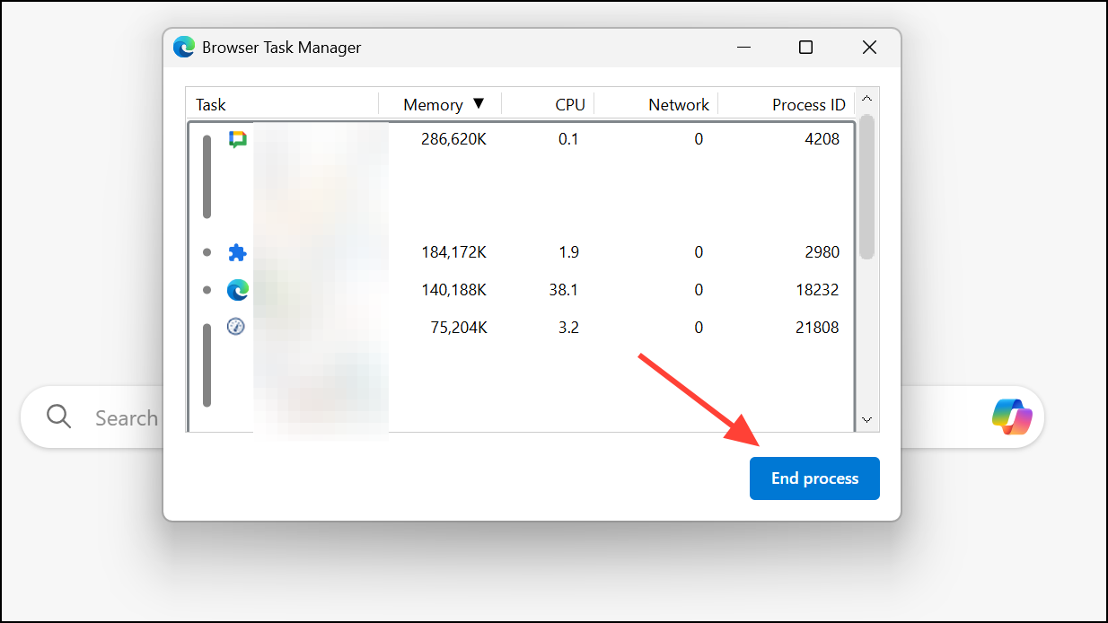 Step 3: Select unnecessary or high-usage items and click End process to close them. Save any important work before ending a process, as this will immediately close the tab or extension.