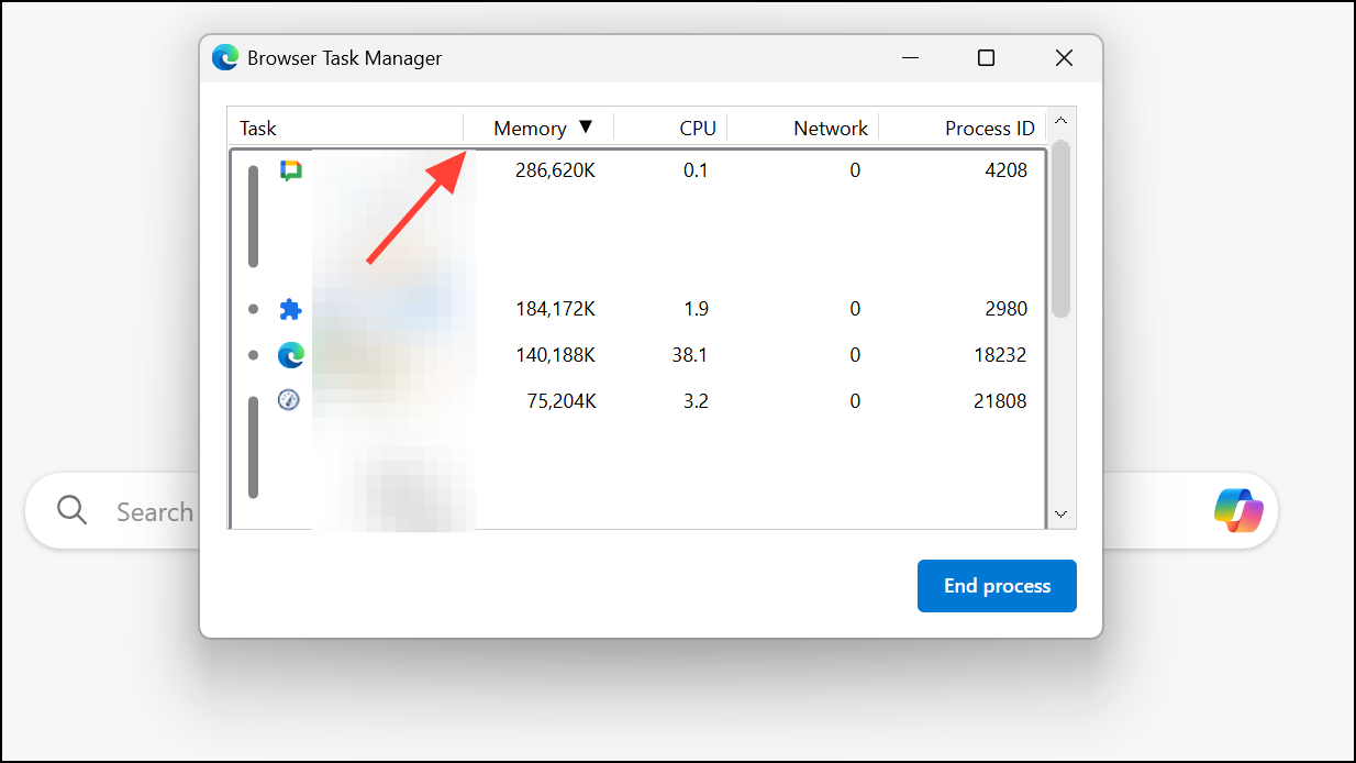 Step 2: Sort by the Memory column to identify which tabs and extensions use the most RAM.