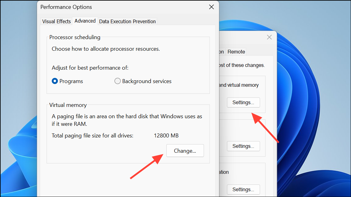 Step 2: Under the Advanced tab, click Settings in the Performance section, then go to Advanced and click Change under Virtual memory.