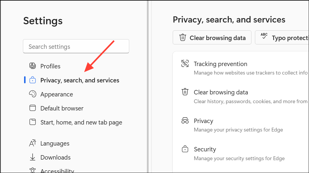Step 1: Open Microsoft Edge and select the menu button (three dots) in the top-right corner. Navigate to Settings, then choose Privacy, search, and services.