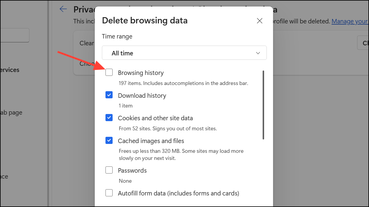 Step 2: Scroll to the Clear browsing data section. Select Choose what to clear every time you close the browser. Review the toggles for different data types. Ensure that Browsing history is turned off. If this setting is enabled, Edge will erase your browsing history each time you exit, resulting in missing or incomplete records.