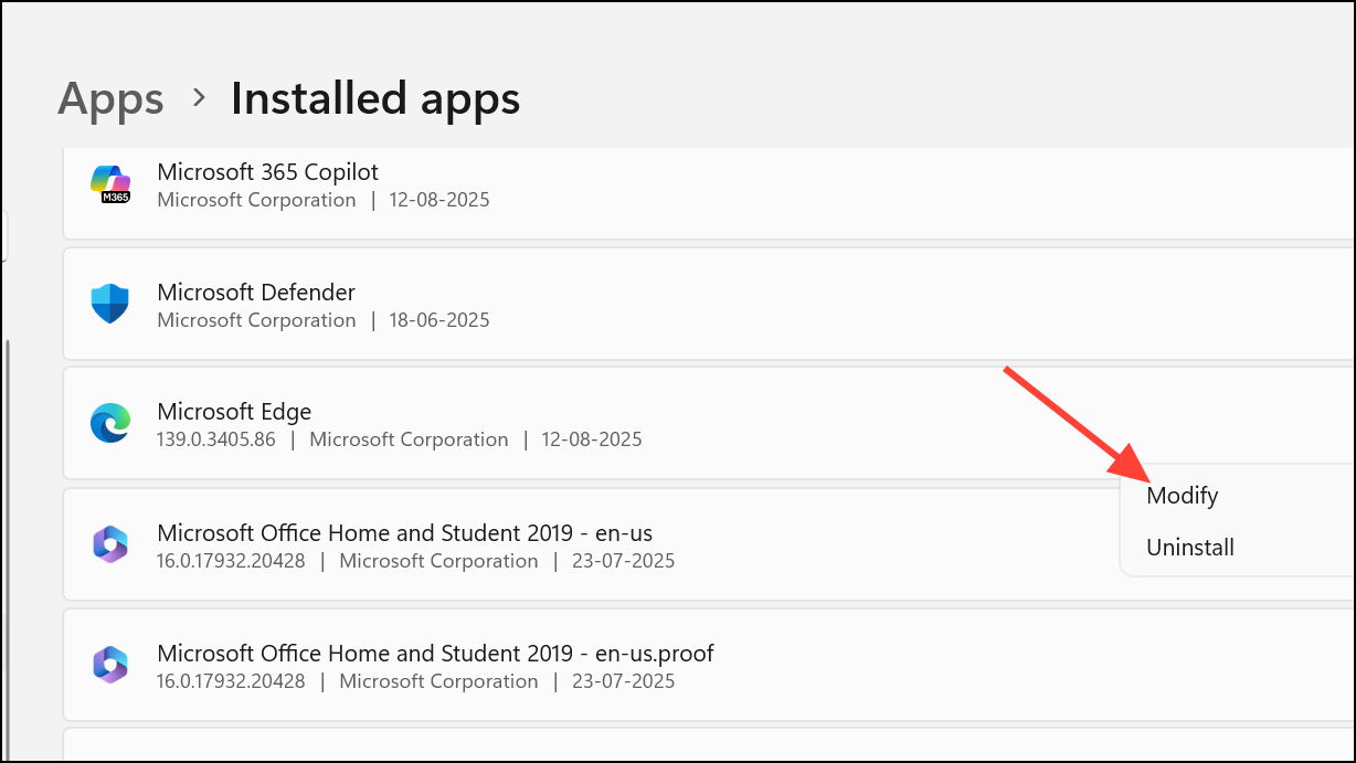 Step 3: Locate Microsoft Edge, click the three dots, and select Modify or Repair. Follow the on-screen instructions. Repairing Edge reinstalls core files without deleting your personal data.