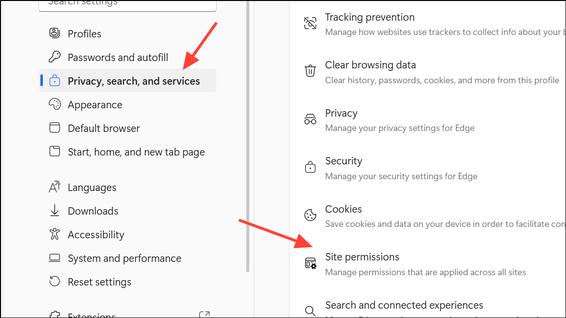 Step 2: Navigate to Privacy, search, and services and select Site permissions.
