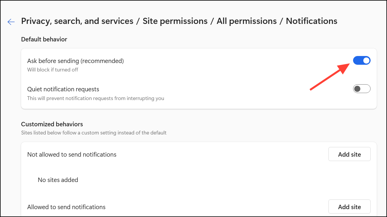 Step 3: Go to All Permissions then Notifications and confirm that the Ask before sending (recommended) toggle is enabled. This setting prompts you to allow or block notifications when a website first requests permission.