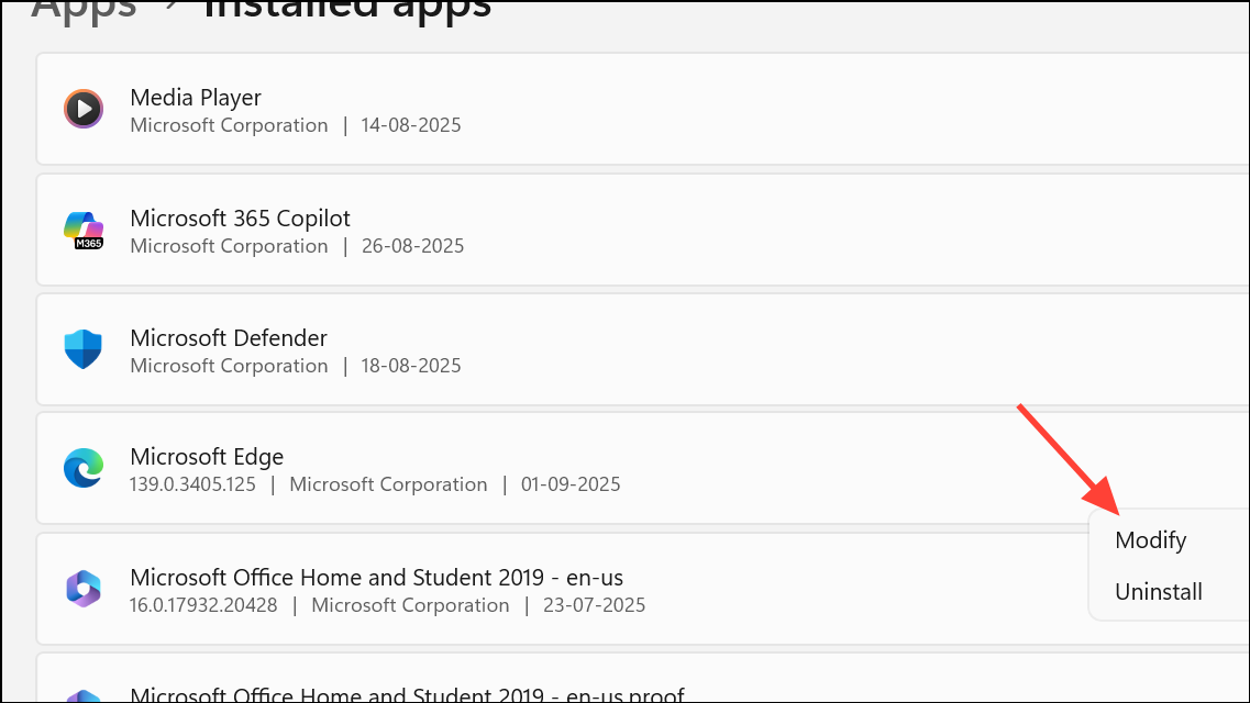 Step 2: Locate Microsoft Edge in the list, click the three-dot menu next to it, and choose Modify.