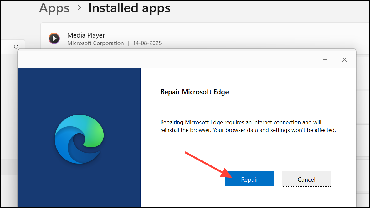 Step 3: Click Repair and follow the prompts. This process reinstalls Edge without deleting your data or settings, resolving potential internal errors that block notifications.