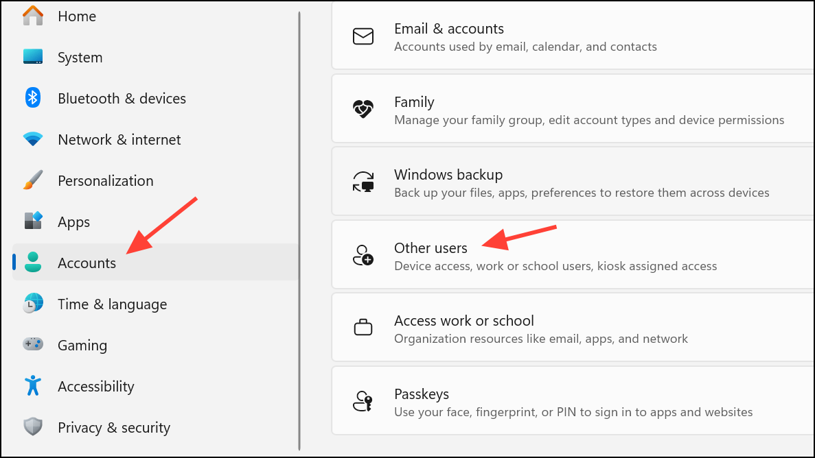 Step 1: Create a new user account in Windows from Settings > Accounts > Other users. Add a new user and set up the profile.