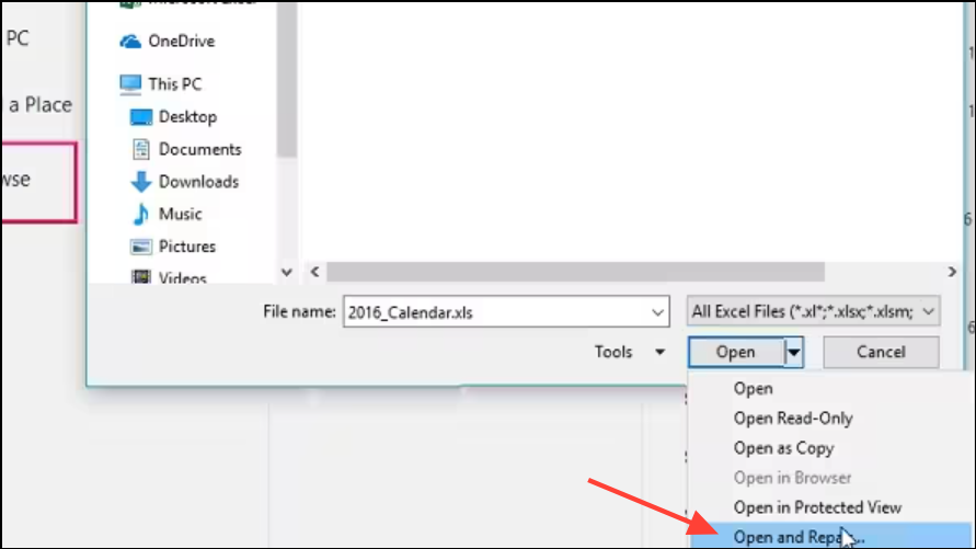 Step 1: If a specific file fails to open while others work, the file may be corrupted. Download the file to your computer, open Excel, and use File > Open to browse for the file. Instead of clicking Open directly, click the arrow next to it and select Open and Repair. Choose either to repair the file or extract data if repair fails.