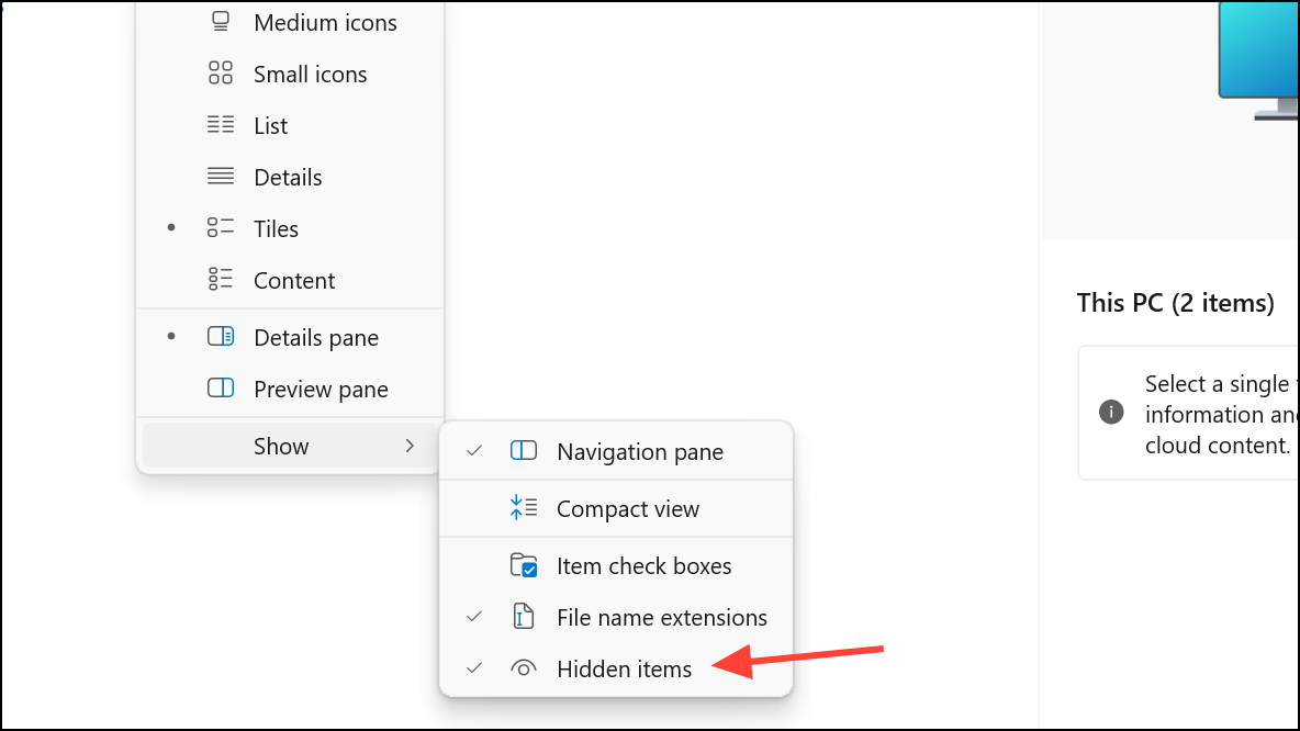 - Show hidden and system files in File Explorer (View > Show > Hidden items).