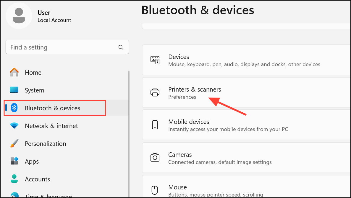 Step 1: Open Windows Settings by pressing Windows key + I on your keyboard. In the Settings window, select Bluetooth and Devices, then choose Printers & scanners from the right pane.