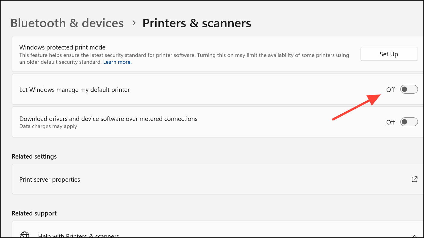 Step 2: Scroll down and locate the option labeled Let Windows to manage my default printer. Toggle off this option. This prevents Windows from automatically switching your default printer, which can cause PowerPoint to lag when it queries printer settings for slide rendering.